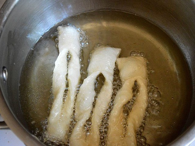 У глибокій чавунній сковороді або казанці добре розігрійте олію. Обсмажте в ньому вироби до золотистого кольору по кілька секунд з кожного боку. Готову хмиз викладайте на велику страву і відразу посипайте подрібненим в пудру цукром.