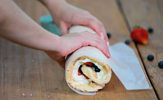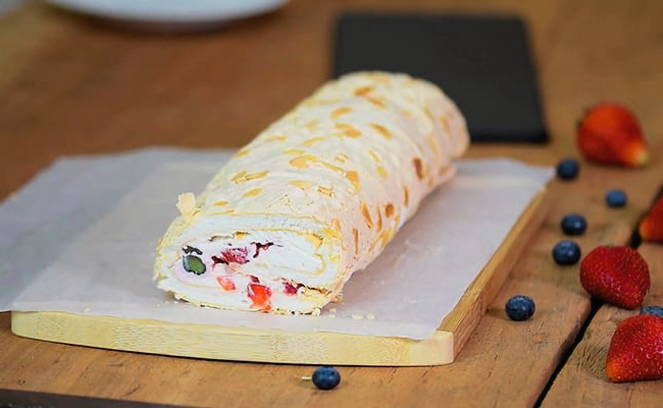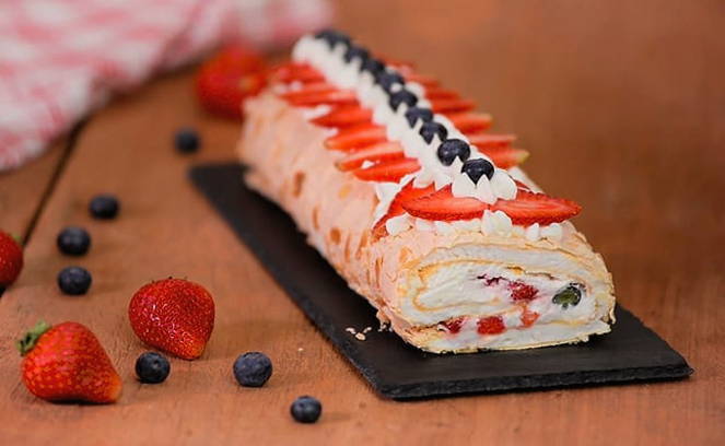 Зверху покриваємо рулет кремом, що залишився, прикрашаємо ягодами.
