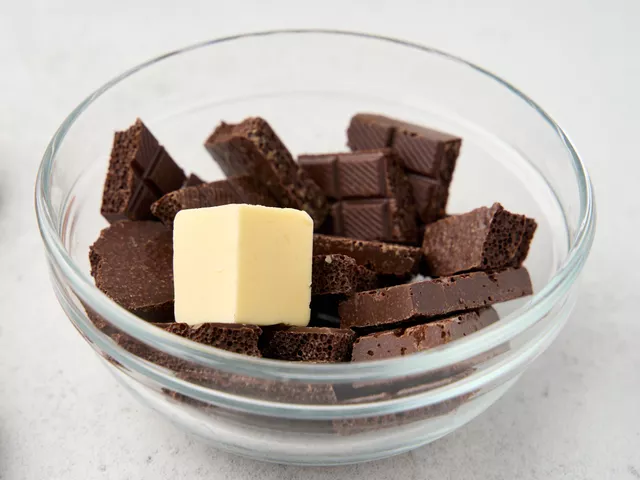 1.Розламайте 200 г шоколаду на часточки і покладіть їх у миску. Додайте до шоколаду вершкове масло. Поставте миску в мікрохвильовку на 30-60 секунд.