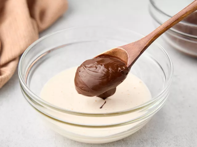 2.Ретельно перемішайте розтоплений шоколад з маслом і трохи остудіть.