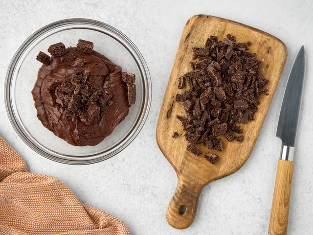 6.Наріжте шоколад, що залишився, на маленькі шматочки. Додайте в тісто і гарненько перемішайте.