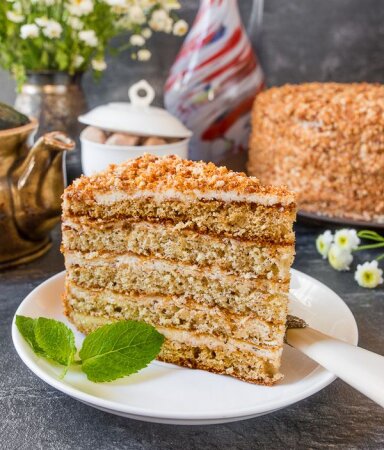 Я вже давно визначилася зі своїм улюбленим рецептом медовика – це медовик «Ательє», який став фаворитом у багатьох моїх читачів. Тим не менш, я не припиняю пробувати нові рецепти медових тортів. І один із них – сьогоднішній румунський медово-горіховий торт. Від звичних для нас медовиків його відрізняють горіхи в складі тіста і крему. Це надає йому дуже цікавий смак. Мій торт з’їли дуже швидко – навіть крихт не залишилося. Думаю, і вам варто спробувати його спекти – це дуже смачно ;) Інгредієнти на форму 21 см:Тісто Крем Рецепт приготування: Готуємо тісто. Для цього кладемо в миску мед, яйця і цукор. збиваємо до однорідного стану (можна просто вінчиком, без міксера). Додаємо просіяне з содою і змішане з меленим фундуком борошно. Замішуємо тісто. Ділимо тісто на 5-6 частин і випікаємо коржі. Викладати найпростіше через борт роз'ємної форми: кладемо її на пергамент, в окружність викладаємо тісто і розподіляємо його шпателем. Знімаємо борт. Перекладаємо пергамент на деко і відправляємо в попередньо розігріту до 180 градусів духовку. Випікаємо по 7-9 хвилин до рум'яного кольору. Повторюємо з рештою тіста. Підрізаємо коржі під один розмір, обрізки розмелюємо на крихту. Готуємо крем. Для цього з'єднуємо масло кімнатної температури зі згущеним молоком і збиваємо на невисокій швидкості до однорідного стану. Додаємо сметану та обсмажений і розмелений фундук (обсмажувати обов'язково - це надає особливого смаку крему), знову збиваємо. Прошаровуємо коржі кремом. Залишками крему покриваємо боки та верх торта. Обсипаємо крихтою з обрізків коржів. Відправляємо торт у холодильник на ніч. Перед подачею даємо торту постояти при кімнатній температурі хвилин 15. Потім нарізаємо і подаємо. Румунський медово-горіховий торт: Спогади з дитинстваМені досі теплішає на душі, коли згадую ті часи, коли ми з мамою готували щось особливе вдома. Була я тоді ще малою дівчинкою, а всі ці солодкі запахи, аромати спецій і меду, що заповнювали нашу маленьку кухню, перетворювали звичайний день на маленьке свято. Це було за радянських часів, коли дістати інгредієнти для десертів було справжнім мистецтвом. Але мама вміла знайти все необхідне, і в той день ми з нею готували щось особливе – румунський медово-горіховий торт. Мама часто розповідала, що цей рецепт вона дізналася від подруги, яка жила на кордоні з Румунією. Мовляв, у них там своя культура випічки, багато хто любить додавати до тортів горіхи і мед, що робить їх більш ситними і поживними. Я слухала маму з захопленням, уявляючи, як ми зараз зануримося в цю кулінарну магію, створимо торт, який матиме смак тепла і затишку. Підготовка інгредієнтівУ ті часи кожен інгредієнт був на вагу золота. Мама дістала з шафи баночку меду, яку берегла для особливого випадку. Це був справжній мед, темний і густий, зі своїм незвичайним ароматом. Його привіз дядько з села, і ми використовували його дуже економно. Горіхи вона сушила сама, на батареї, а потім обережно розтирала качалкою, щоб вони перетворилися на маленькі шматочки, які додадуть особливого смаку. Я стояла поруч і дивилася, як мама готує все необхідне. Її рухи були легкими й впевненими. Вона знала, як правильно змішати інгредієнти, щоб отримати найсмачніший результат. Це було справжнє мистецтво, і я була щаслива, що маю можливість вчитися у неї. Історія румунського медово-горіхового 